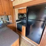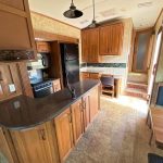 Designed for extended stays, the kitchen and living area provide ample counter space, abundant cabinetry, and a comfortable layout ideal for full-time or seasonal use.