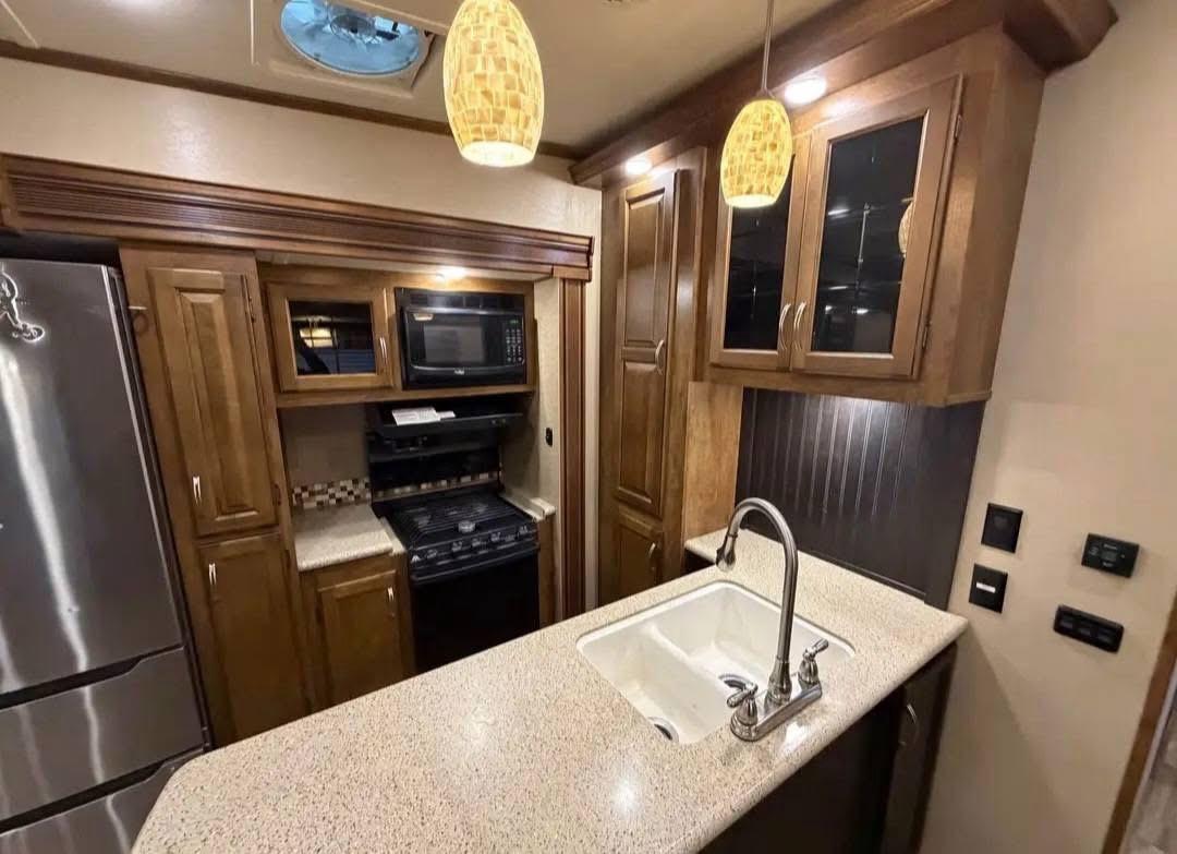 • Residential-style kitchen with 3-way refrigerator, microwave, oven, and large pantry